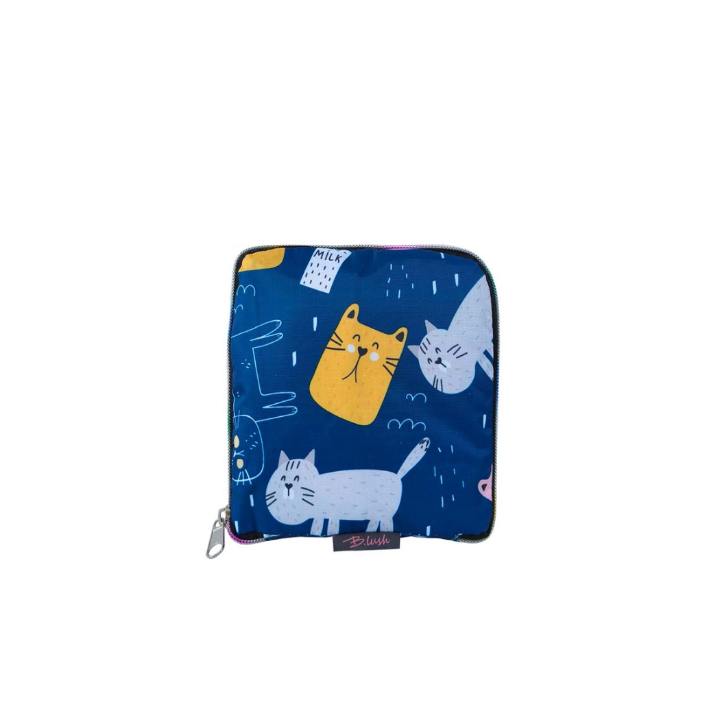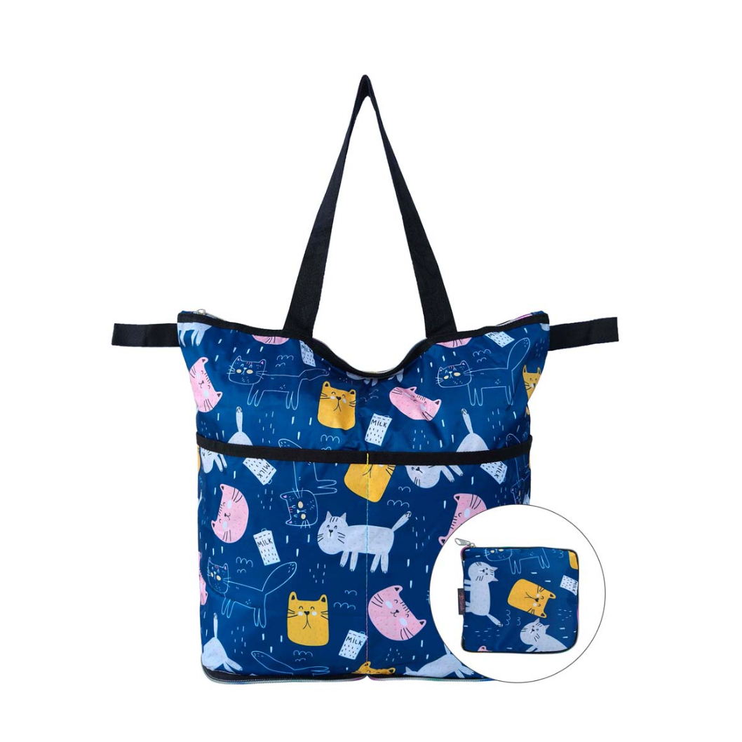 - Folds in and out of a square with a zipper. That square shape turns into the front of the shopping bag when opened up. This eco bag has additional straps that hook onto the handles of a wheelchair or stroller.